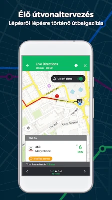 A Moovit intelligens útvonaltervezője nem csak a lehetőségeket sorolja fel, hanem az aktuális forgalmi adatok alapján a legoptimálisabb kombinációt kínálja fel. Felejtse el a várakozással töltött perceket: valós idejű érkezési információkat kaphat a buszokról és vonatokról, közvetlenül a GPS alapú rendszerekből. Így pontosan tudhatja, mikor induljon el, és mikor érkezik meg. Emellett a kritikus szolgáltatási riasztások és a menetrendi változásokról szóló értesítések révén időben értesülhet az esetleges késésekről vagy fennakadásokról, így mindig felkészülten tervezhet. Az alkalmazás lépésről lépésre vezeti végig az úton, és még azt is jelzi, mikor kell leszállnia, hogy Ön teljesen a céljára koncentrálhasson.