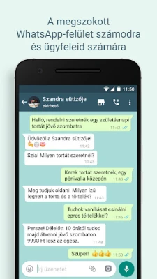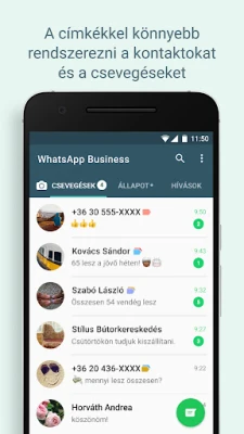 A WhatsApp Business beépített eszközökkel segíti vállalkozásod okosabb működését, a bizalom építését és a növekedést. Élvezd az ingyenes hívásokat és üzeneteket, automatikus válaszokat, távolléti üzeneteket és beszélgetés-címkézést, hogy időt takaríts meg és sose maradj le egyetlen lehetőségről sem.